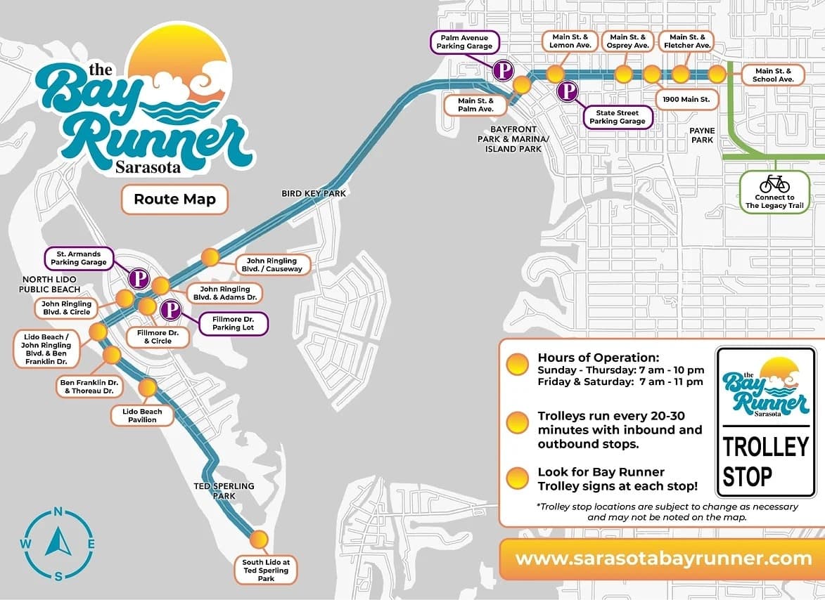 Have you been out of the loop about the Bay Runner Sarasota- which apparently launched all the way back in March 2022 - because until July 2023, we were too! But we gave it a try and you should too. The Bay Runner is an open-air trolley that provides complimentary service seven days a week, with multiple stops along the way between Lido Key, St. Armands Circle, and downtown Sarasota - just check out the map below! Continuous service is provided throughout the day. The summer posted schedule starts and ends earlier than its in-season 8am-midnight availability, 7am to 10pm or 11pm depending on the day.