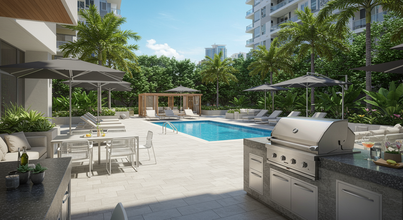 The building features a grand two-story rotunda lobby, where you'll be greeted by reception and concierge service. Each residence in the secured-access gated community receives two parking spaces, one pre-wired for electric vehicles, as well as private storage. Elevators are semi-private with controlled access via fob. In addition to these more practical items, the fun stuff all lies on the amenity deck, which is chock-full of all the resort-style amenities to make your home life luxurious on the daily: